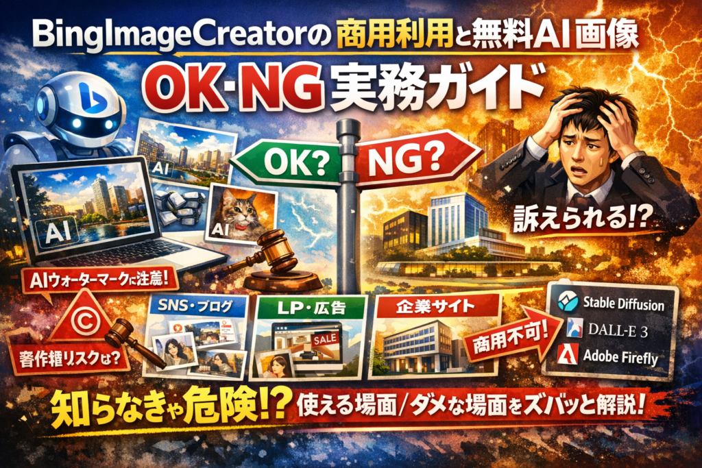 ここ数年、Bing Image Creatorをはじめとした無料AI画像を、LPや採用サイト、Googleビジネスプロフィール、Instagramクリエイティブなどに活用したいという相談が一気に増えました。制作コストは下がる一方で、「ウォーターマークが付いたまま入稿してブランドイメージを損ねた」「権利まわりの確認をせずにAI画像を多用し、社内で差し替え作業が大量発生した」といったケースも、規模の大小を問わず何度も見てきました。