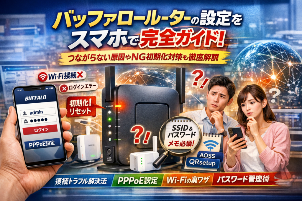 本記事では、iPhoneとAndroidそれぞれからのバッファロー無線ルーター設定画面の開き方、adminログインURLとパスワード周りの整理、スマホで行うプロバイダ情報とPPPoE設定、中継器や子機を含めた接続方法を、「どの順番で確認すれば一番早く復旧できるか」という視点で再構成しています。「バッファロー ルーター設定 スマホ つながらない」「設定画面が表示されない」「パスワードが違います」といった再検索を繰り返しているなら、この1本で初期設定からトラブル復旧、NGな初期化対策、パスワード管理までを通しで整理し、今後の時間とストレスの損失を止めていただけます。