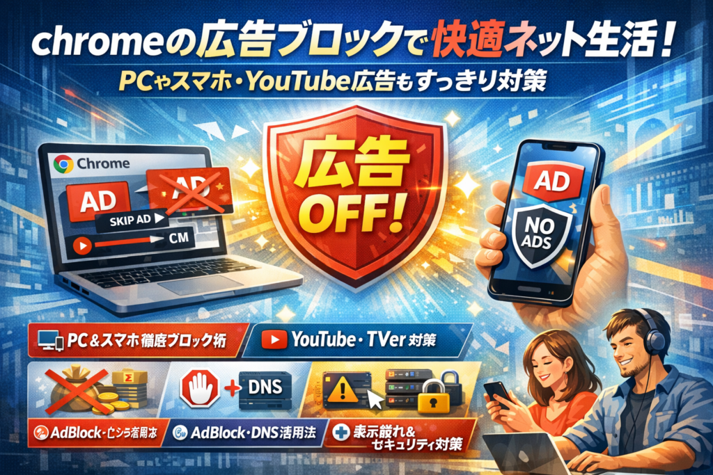 Chromeの広告がうざいと感じて「chrome 広告ブロック」と検索すると、多くはポップアップ広告の消し方やAdBlockなど拡張機能の入れ方だけを紹介しています。しかしその通りに設定しても、スマホ版Chromeでは広告がほとんど減らなかったり、PCでYouTube広告だけ残ったり、最悪の場合はTVerや決済ページ、問い合わせフォームが動かなくなることがあります。本当に必要なのは「全部消すこと」ではなく、端末別と用途別にどこまで広告をブロックするかを設計することです。
