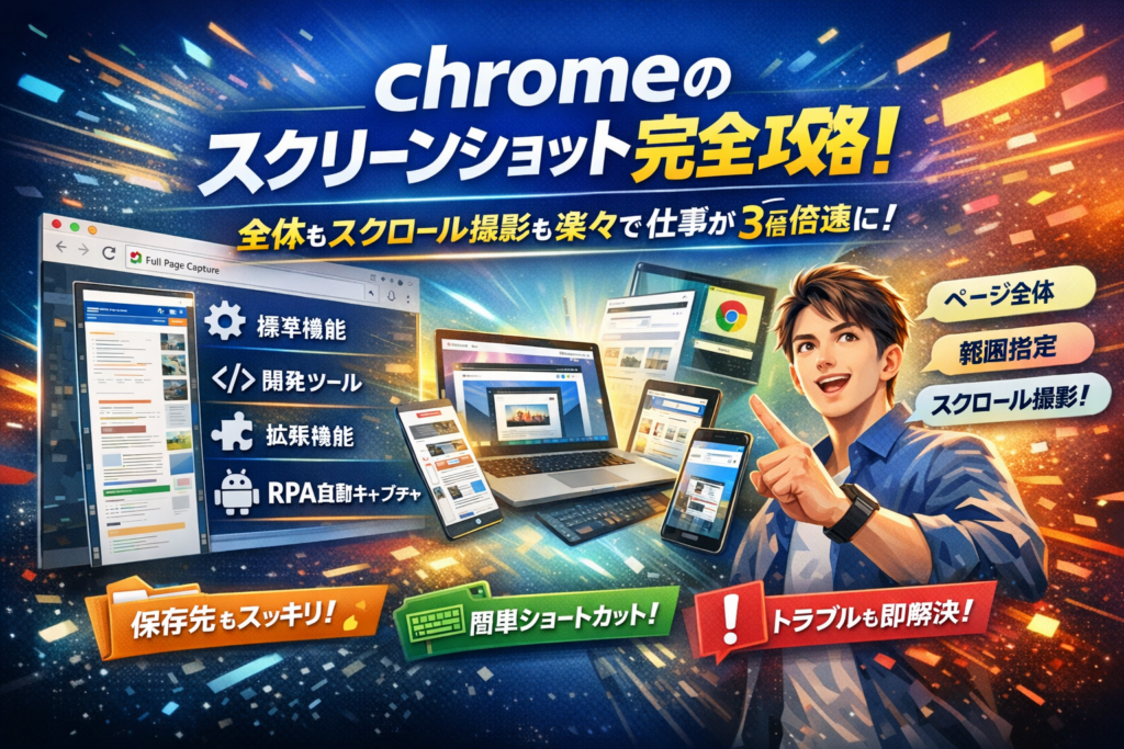 この記事では、Windows/Mac/Chromebook/スマホのChromeスクリーンショットを「標準機能」「デベロッパーツール」「拡張機能」「RPAによる自動キャプチャ」という4軸で整理し、どの環境でも迷わず「ページ全体」「全画面」「範囲指定」「スクロール」撮影ができる状態まで一気に持っていきます。