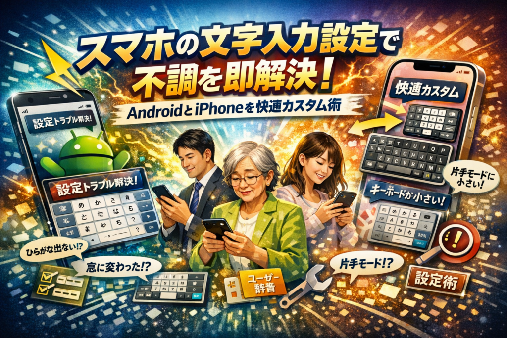 本記事では、まず「スマホ 文字入力設定がおかしい」と感じたときに一発で原因を切り分ける症状別チェックから入り、AndroidとiPhoneそれぞれの文字入力画面・キーボード切り替え・日本語キーボード復旧の具体手順を示します。そのうえで、30代ビジネスパーソン、60代シニア、家族の設定係という現実のペルソナごとに、Gboardやメーカー独自キーボード、Simejiをどう設定すれば1日1,000字以上でも疲れないかを解説します。