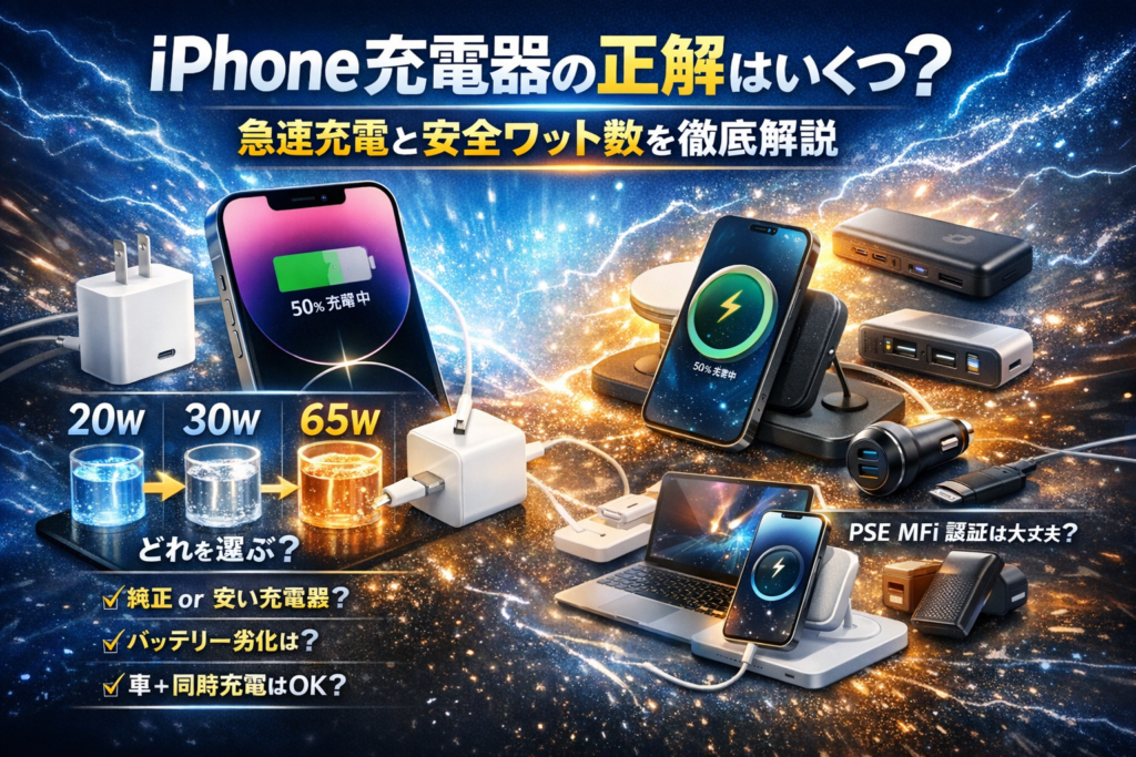 この記事では、iPhone14やSE第3世代を含む各機種が対応する急速充電とワイヤレス充電の上限を前提に、20W・30W・65Wのどれを選ぶかをシーン別に決める設計方法、iPadやMacBookとの同時充電の考え方、バッテリー劣化を招くNGな使い方の線引きを具体的に示します。さらに、Apple純正とAnkerなどサードパーティ製のリアルな違い、PSEとMFi認証で危険な充電器を排除する基準、自宅・外出・車での最小構成までまとめています。