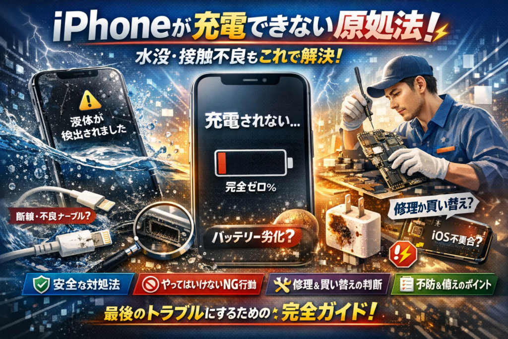 朝起きたらiPhoneの電源が入らない、充電ケーブルをさしても充電マークすらつかない、水没後に「液体が検出されました」と出て充電できない。こうした「iPhoneが急に充電できない」状態で、なんとなくケーブルを替えたり差し込み口をつまようじでほじったりすると、データと本体、そして修理費の三つを同時に失うリスクが一気に高まります。