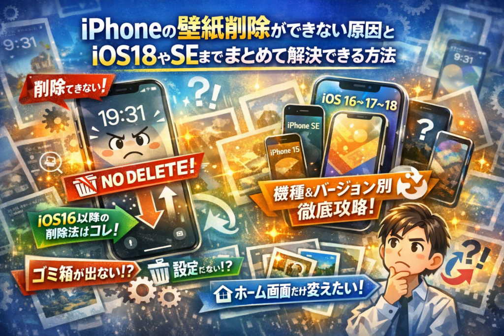 iPhoneの壁紙を削除しようとして、ロック画面を長押ししても反応しない、ゴミ箱マークが出ない、設定アプリから探しても「壁紙 削除」の項目が見つからない…この行き止まりが続くほど、作業時間もストレスも静かに奪われています。しかもiOS16以降はロック画面ギャラリー方式に変わり、iOS15以前の「設定>壁紙で差し替えるだけ」という感覚のままだと、iPhone14やiPhone15、iPhoneSE、iPhone8など機種ごとの違いでさらに混乱しがちです。実は、現在のiOSでは壁紙はロック画面を長押しして上にスワイプして削除し、設定アプリからは消せないのが仕様です。本記事では、その標準的な方法だけでなく、「iPhone 壁紙 削除 できない」「iPhone SE 壁紙 削除 設定から」と何度も再検索してしまう原因を、症状別とOS別に分解し、ホーム画面だけ変えたいケースや写真を消しても壁紙が残る理由、iOS17やiOS18の細かな違いまで一気に整理します。ここで仕組みごと理解しておけば、今後のアップデートや別機種でも迷わずに壁紙を管理できるようになります。この記事を読まずに試行錯誤を続けるか、数分で根本から片づけるか、その差は小さくありません。