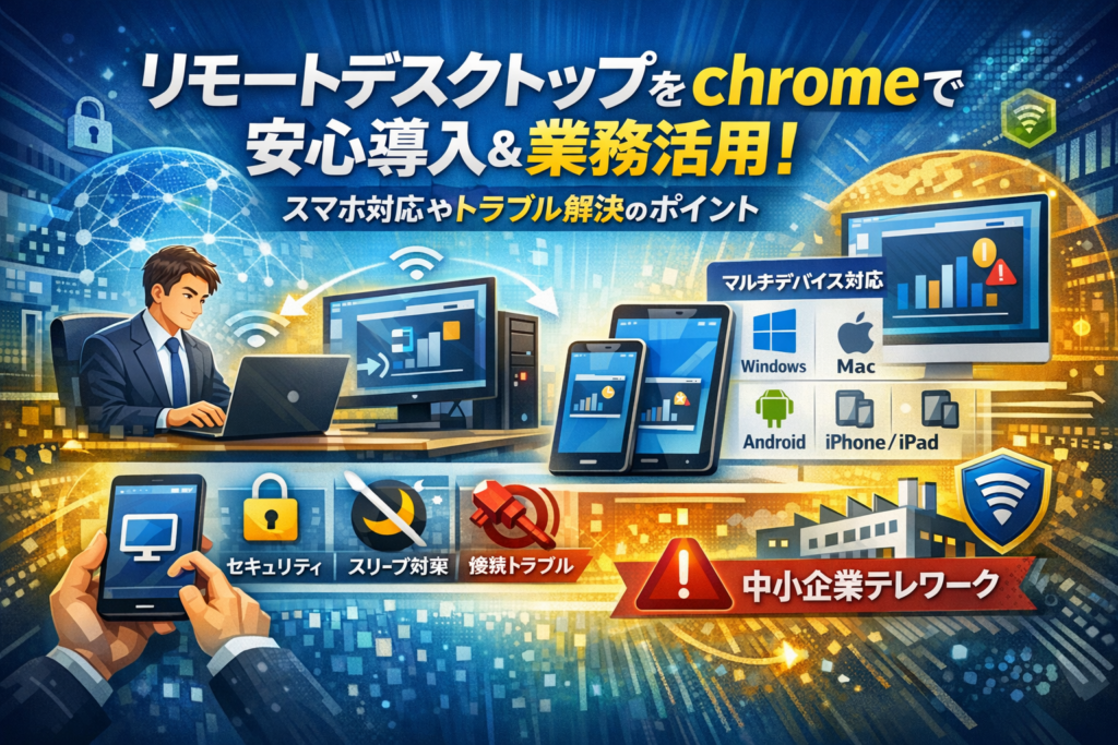 問題は、そのレベルで止めると業務で使った瞬間に「想定外の止まり方」をすることです。テレワークで頻発するスリープとセッション切断、スマホやiPhone・iPadからの操作の限界、Chromeリモートデスクトップの危険性や欠点、退職者や私物端末にアクセス経路が残り続けるリスクは、設定マニュアルだけでは見えてきません。