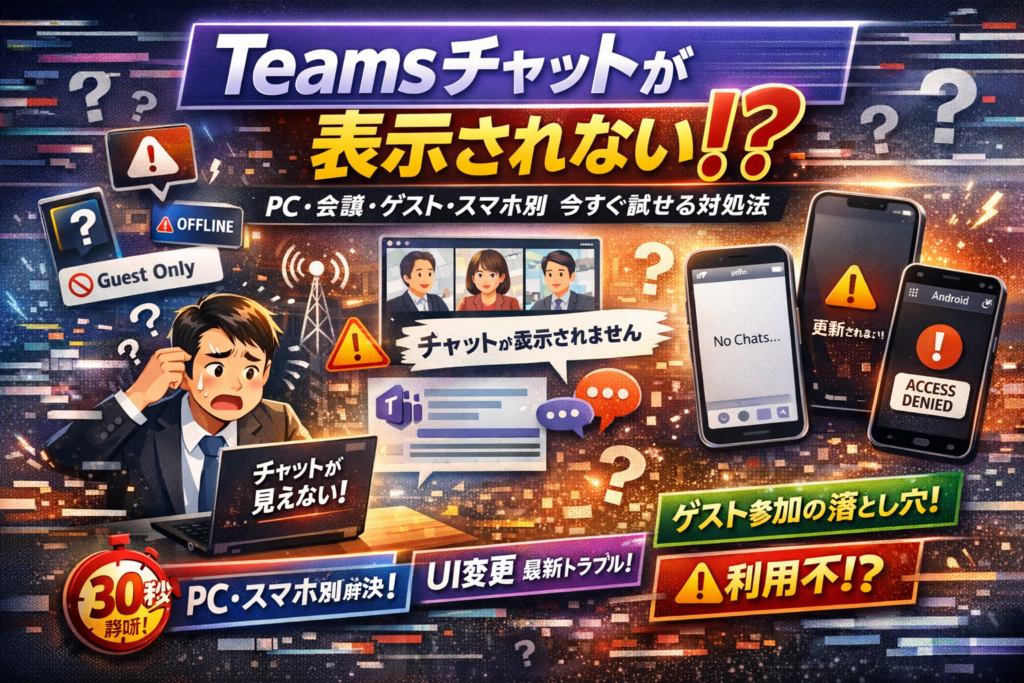 Teamsのチャットが突然表示されないのに、会議は進む、上司からのメッセージも飛んでくる。この数分の遅れだけで、商談や社内調整の精度は確実に落ちます。多くの解説は「再起動しましょう」「アップデートしましょう」で終わりますが、実務ではそれで解決するケースは一部にすぎません。実際には、PCかスマホか、通常チャットかTeams会議チャットか、ゲストか社内か、さらに新しいTeamsのUI変更やポリシー設定などが絡み合い、「Teamsチャットが表示されない」「Teams会議でチャットが表示されない」「スマホだけTeamsチャットが更新されない」といった症状に分かれます。この記事は、そうした現場の「もやっとした不具合」を30秒で切り分け、PC版・ブラウザ版・iPhone・Android・ゲスト参加・Free版まで、今すぐ試せる手順に直結させることだけを目的に構成しています。チャットアイコンがそもそも出ない、左側のチャットメニューが丸ごと消えた、会議後チャットが残らない、「チャットは一時的にご利用いただけません」と表示される場合まで、どこまでが自分で直せて、どこからが情シスや管理者に引き継ぐべきかを明確にします。一般的な手順で時間を溶かす前に、自分の症状に合う章へ飛び、最短ルートで「Teamsチャットが表示されない」状態を業務に支障が出ないレベルまで引き上げてください。