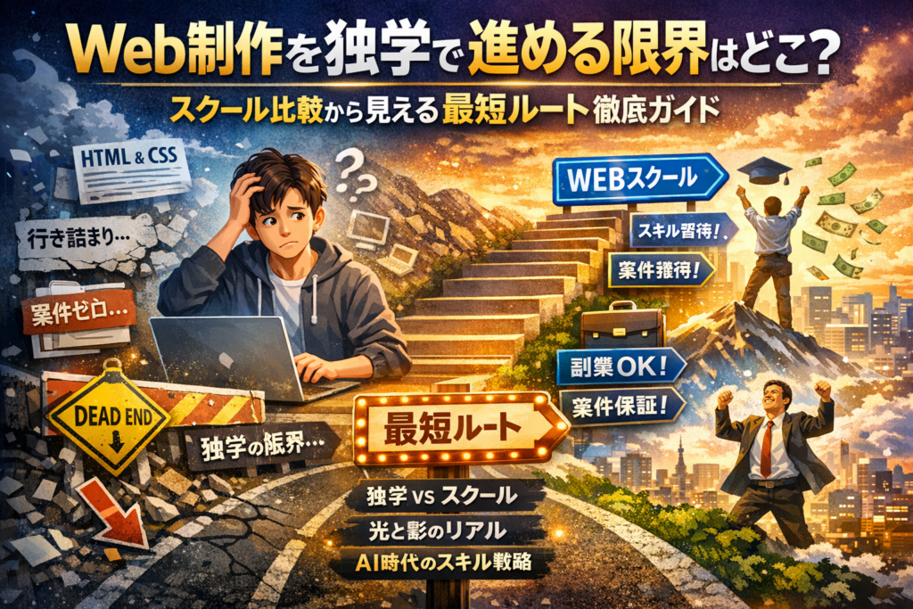 本記事では、Web制作を独学3か月で身につく範囲と、6か月〜1年でぶつかる限界を具体的な失敗パターンから分解します。そのうえで、Webデザインスクールの「光と影」、案件保証や副業サポートの現実、フリーランスWeb制作の年収レンジ、AI時代に残るスキルまでを、独学とスクールのハイブリッド戦略として整理します。