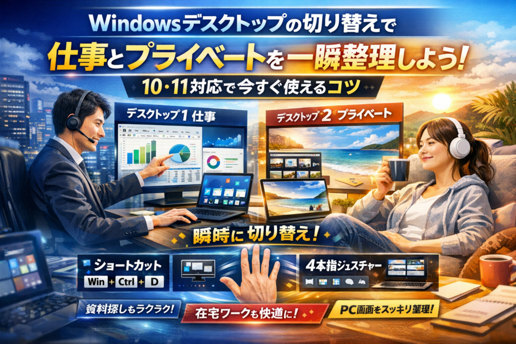 このページでは、Windows10とWindows11の仮想デスクトップを軸に、ショートカットキー、タスクビューアイコン、マウスやタッチパッドの4本指ジェスチャーまで、複数デスクトップの操作を一気に整理します。そのうえで、在宅ワーカー向けの仕事・会議・プライベート用レイアウト、営業がプレゼンと社内資料を素早く切り替える構成、情シスが社内標準として設計すべきルールまで具体的に示します。