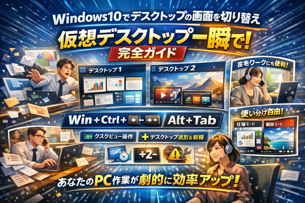 仕事中にウィンドウだらけの画面を前に、目的の資料を探してマウスを動かし続けているなら、それだけで毎日かなりの時間を捨てています。しかも「windows10 デスクトップ 画面 切り替え」で調べても、仮想デスクトップ切り替えのショートカットだけ、タスクビューだけ、という分断された情報が多く、結局どれを覚えればいいのか分からないままになりがちです。