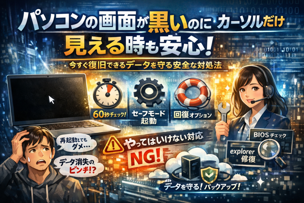 パソコンの画面が黒いのにカーソルだけ見える時も安心!今すぐ復旧できるデータを守る安全な対処法