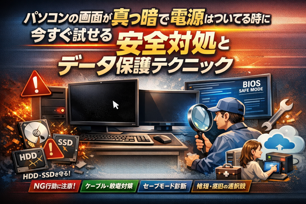 パソコンの画面が真っ暗で電源はついてる時に今すぐ試せる安全対処とデータ保護テクニック