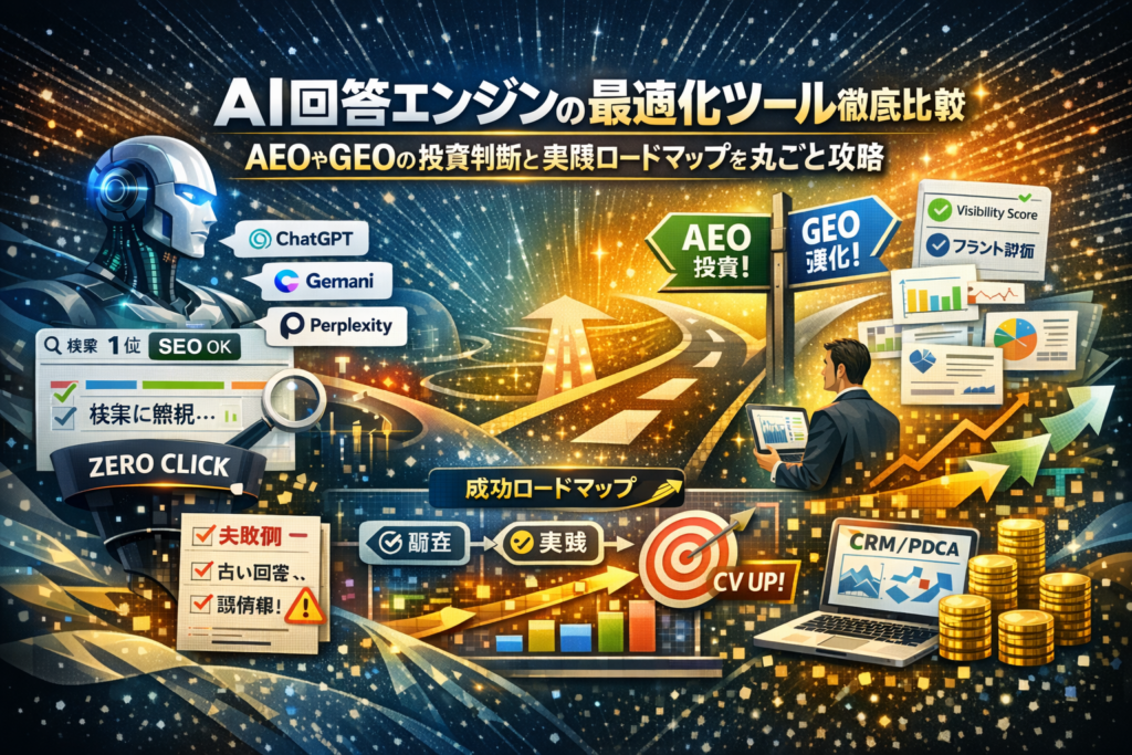 本記事では、AEO・GEO・LLMO・AIO・SEOの関係整理から、回答エンジン特化ツールと既存SEOツール、口コミ監視ツールまでを比較し、無料で始める初期対策から、本格的なAEO投資に踏み切るタイミング、失敗パターンを避けるロードマップまでを一気通貫で解説します。ツール名の羅列ではなく、「どの規模で何をKPIにするなら、どのタイプのツールにいくらまで投資すべきか」まで踏み込んでいます。AIに無視されるブランドになるか、推薦されるブランドになるかを分ける実務の分岐点を、この一本で押さえてください。