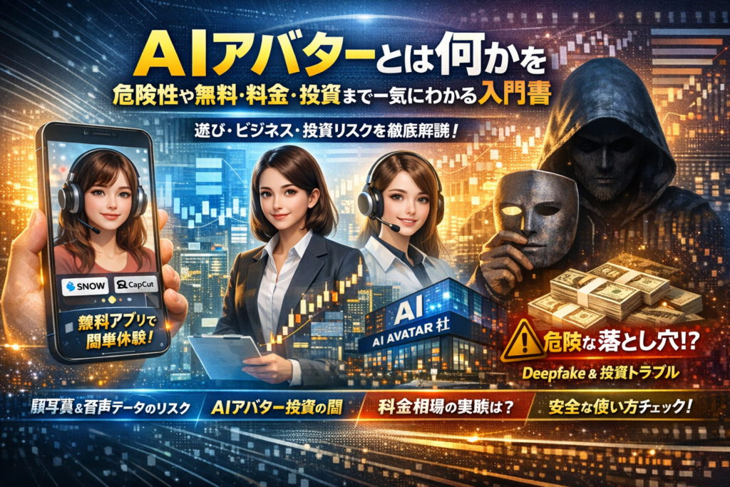 本記事では、AIアバターとは何かをSnowやCapCutのようなAIアバターアプリから企業のWeb接客まで一気に俯瞰し、AIアバター無料作成やAIアバター無料サイトの安全な使いどころ、AIアバターの料金相場、AI AVATAR社ナスダック上場などの勧誘文句の見抜き方までを一本に統合しました。AIアバターは危険性だけを恐れて避けても、無批判に飛びついても損をします。どこまでが「遊び」で、どこからが「ビジネス」と「投資リスク」なのかを、現場の失敗例とともに具体的な判断軸に落とし込んでいます。数分で読み切れますので、AIアバターに関わる前に、自分と自社を守るための最低限の防御線をここで固めてください。