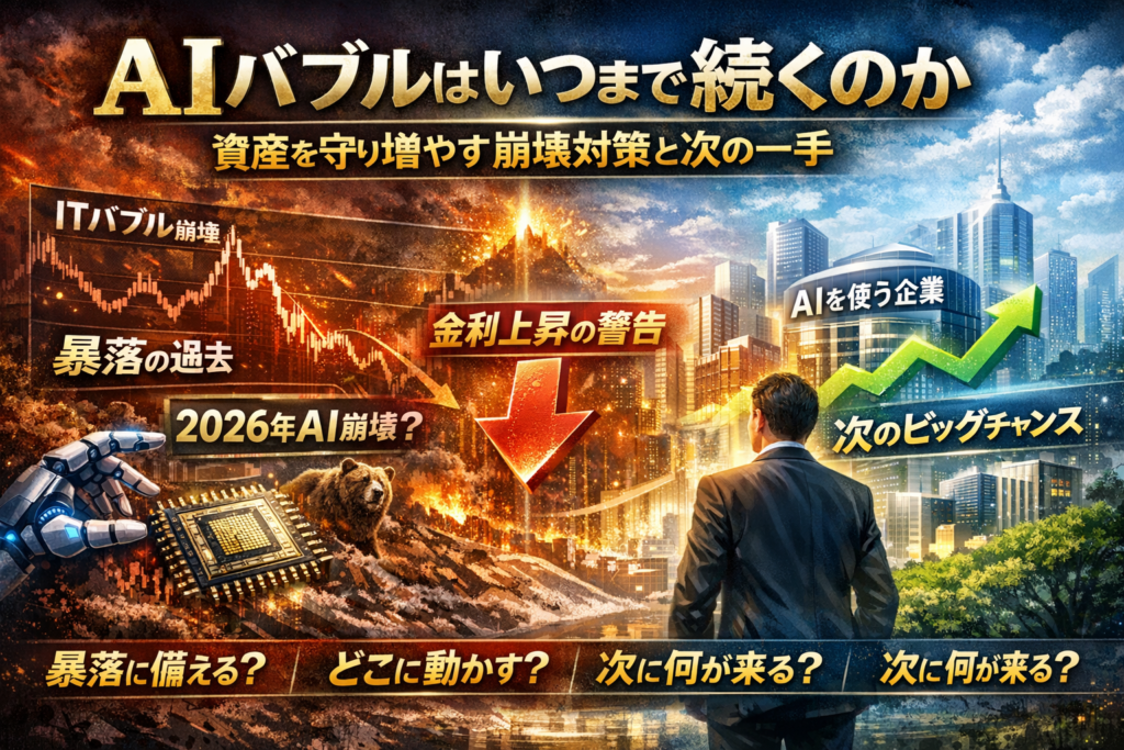 あなたの資産を減らす最大のリスクは、「AIバブルいつまで」と検索しながらも、具体的にポジションを変えないことです。いまのAI関連株や半導体ETF、AI投信がバブルなのか、ITバブルと何が違うのかが曖昧なままでは、「2026年AIバブル崩壊」などの見出しに振り回され、含み益も退職金も守れません。