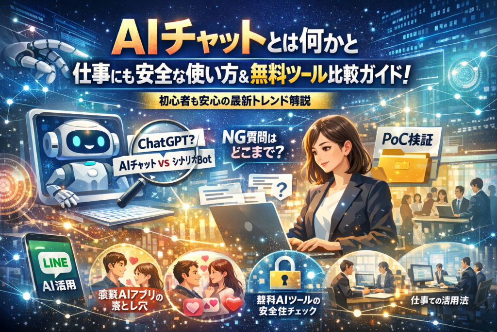 本記事は、AIチャットとは何かをゼロから整理しつつ、チャットAIとChatGPTの違い、シナリオ型チャットボットとの線引き、AIに任せてはいけない質問の範囲までを一気に言語化します。さらに、社内ヘルプデスクや問い合わせ対応、LINEのAIチャットとは何かという実務視点、AIチャットボット無料ツールでどこまで安全にできるか、恋愛系AIチャットアプリやAI恋人アプリの依存・課金リスクといった生活側の論点も、同じ土俵で整理します。