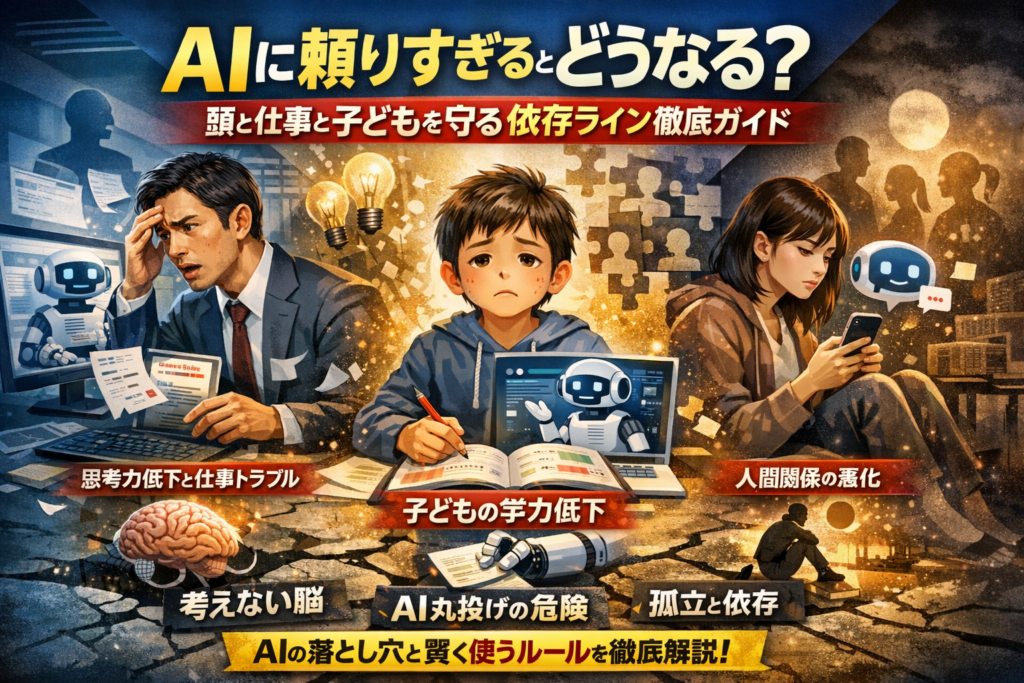 そのうえで、生成AI頼りすぎにならないために、社会人・保護者・管理職それぞれがどこまでAIに頼るかという依存ラインを具体的なルールとチェックリストに落とし込みます。AIに頼りすぎる人と賢く使う人の差は、才能ではなく「どこで自分の頭を必ず通すか」を決めているかどうかです。この記事を読み切れば、AIのメリットを取り込みつつ、致命的なAIデメリットを現場レベルでコントロールするための実務的な解決策がそろいます。