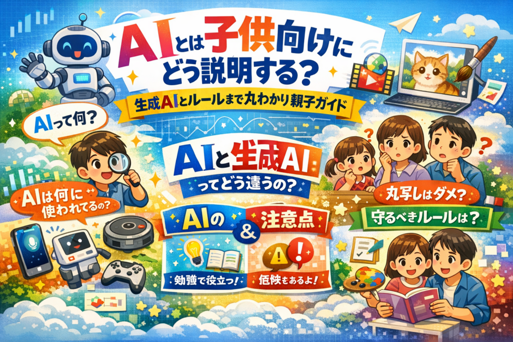 さらに、実際に起きている調べ学習のAI丸写し問題や、生成AI子供向けアプリや授業でのトラブルを前提に、全面禁止でも放任でもない具体的な家庭ルールと授業ルールを提示します。この記事を読み進めれば、「AIとは子供向けにどう説明するか」だけでなく、「どこまで任せてどこから自分の頭で考えるか」を親子と先生が共通言語で話せるようになります。