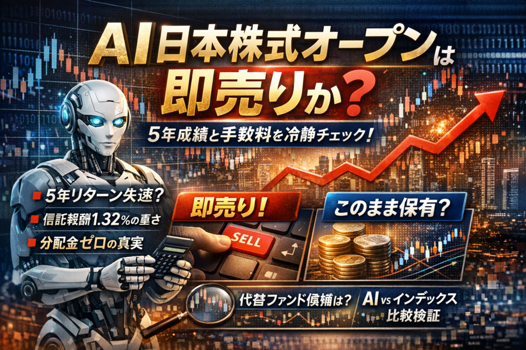 この記事では、販売会社の説明文や目論見書では分からないポイントだけに絞ります。AIが何をしていて、実際はどれくらい日本株インデックスと似た動きをしているのか。分配金ゼロが本当に安心材料なのか。手数料とリターンのバランスは他のAI関連投資信託ランキング上位ファンドやインデックスと比較して妥当なのか。そして、あなたは今「即売り」すべきか、それとも静観すべきか。