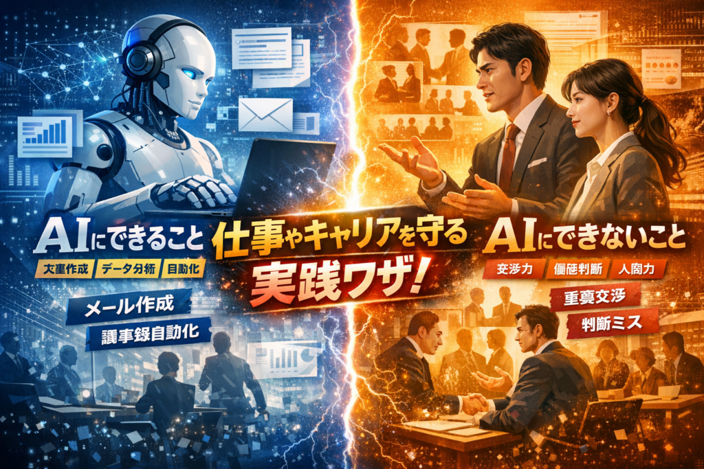 ここ数年、支援先の経営者や現場責任者から「AIに仕事を奪われるのではなく、味方にしたいが、どこまで任せていいのか分からない」という相談を受け続けてきました。実際、2019年頃から約300社でAI導入をサポートする中で、メールや議事録、資料作成を一気に任せて生産性が跳ね上がったケースと、生成AIにお詫びメールを任せて炎上し、信頼回復に半年以上かかったケースの両方を見ています。私自身、自社の会議で議事録ツールを入れた際、数値やタスクは完璧なのに、顧客の微妙な表情の変化やその場の空気感が一切残っておらず、「ここを人間が握らないと危ない」と強く感じました。本記事では、こうした現場の成功と失敗から、AIにできることとできないことの線引きを具体的なタスク単位で示し、読者一人ひとりが自分の仕事やキャリアを守りながら、AIを戦力として使いこなせる判断軸を届けたいと考えています。