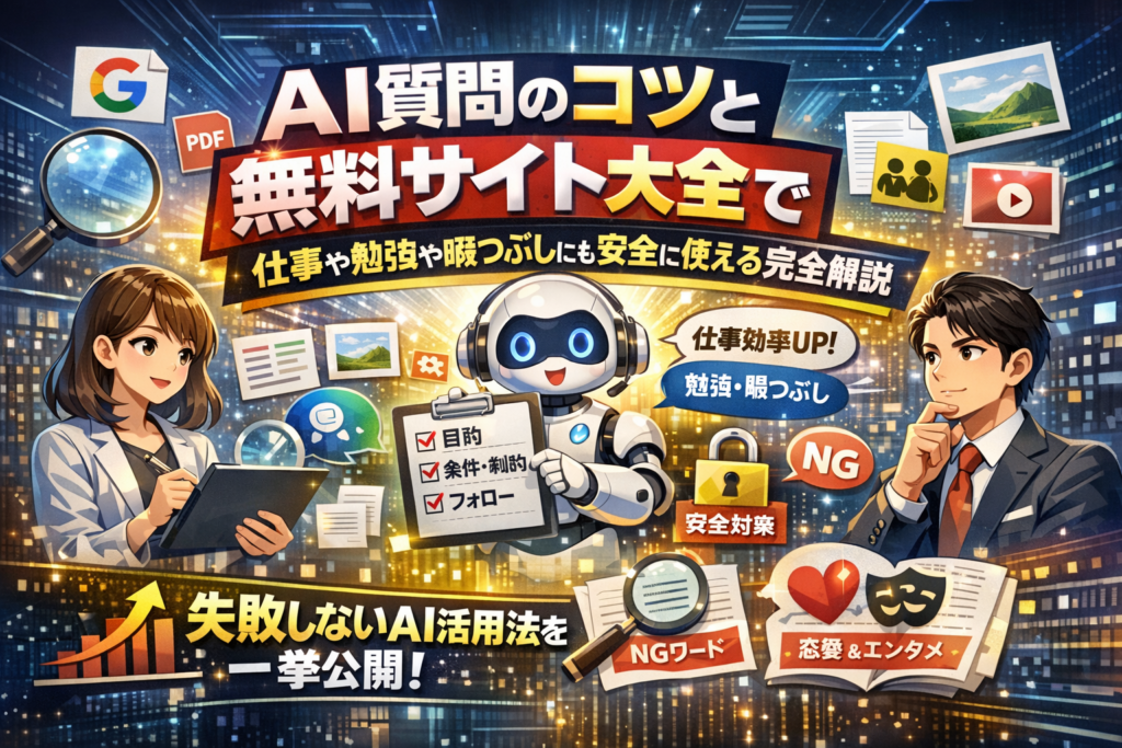 本記事は、AIに質問すること自体が初級レベルを抜け出せていない20〜30代向けに、「AI質問の仕方」を現場目線で作り替えるための完全ガイドです。最初に、AIチャット無料サイトやAI質問アプリで起きがちな失敗パターンを分解し、次に4ステップの質問フレームで仕事や勉強、暇つぶしまで一気に改善します。ChatGPTやGoogle Geminiなど質問に答えるAIの向き不向き、PDFや画像へのAI質問のコツ、恋愛相談や面白いネタで遊ぶ時の線引き、そして「AIに質問してはいけないこと」の安全ラインまで一度で整理できます。
