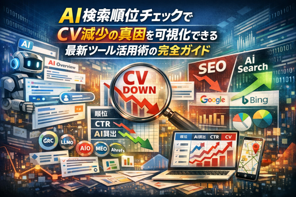 本記事では、まずGRCやSEO検索順位チェックツール、ラッコキーワードやキーワードプランナー、Ahrefsなどの王道ツールで何が把握できて何が抜け落ちるのかを整理します。そのうえで、AI Overview計測やLLMOツール、AIO計測ツール、AIOチェッカーを使い、GoogleとBing検索結果、MEO順位チェックツールまで含めて「順位」「AI露出」「CTR」「CV」を一枚のレポートで可視化する実務フローを提示します。