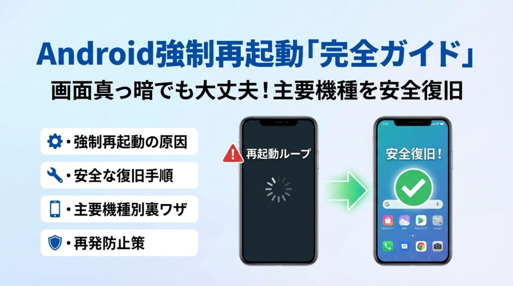 支払いの直前や大事な連絡の最中に、Androidスマホの画面が真っ暗になり一切反応しなくなると、多くの人は「とりあえず何度も強制再起動を試す」ことで状況を悪化させています。この誤った対処こそが、データ消失や再起動ループを招く最大の原因です。この記事では、XperiaやGalaxy、AQUOS、Pixel、OPPO、かんたんスマホなど主要機種ごとのandroid強制再起動の正しいやり方と、ボタンを押しても再起動できない時の症状別フローチャートを1本に統合しました。画面真っ暗で音だけ鳴る、ロゴで止まる、電源ボタンが効かないといった状態で、どこまで自分で試し、どこからプロに任せるべきかを明確に線引きしています。さらに、セーフモードやアプリ強制終了、リカバリーモードまで含めた「次の一手」と、そもそも強制再起動に頼らなくて済むAndroidの使い方も整理しました。今まさに固まっている端末を安全に復旧させたい人も、将来のトラブルを未然に防ぎたい人も、この数分の読み込みを省くことが最も高くつくコストになります。