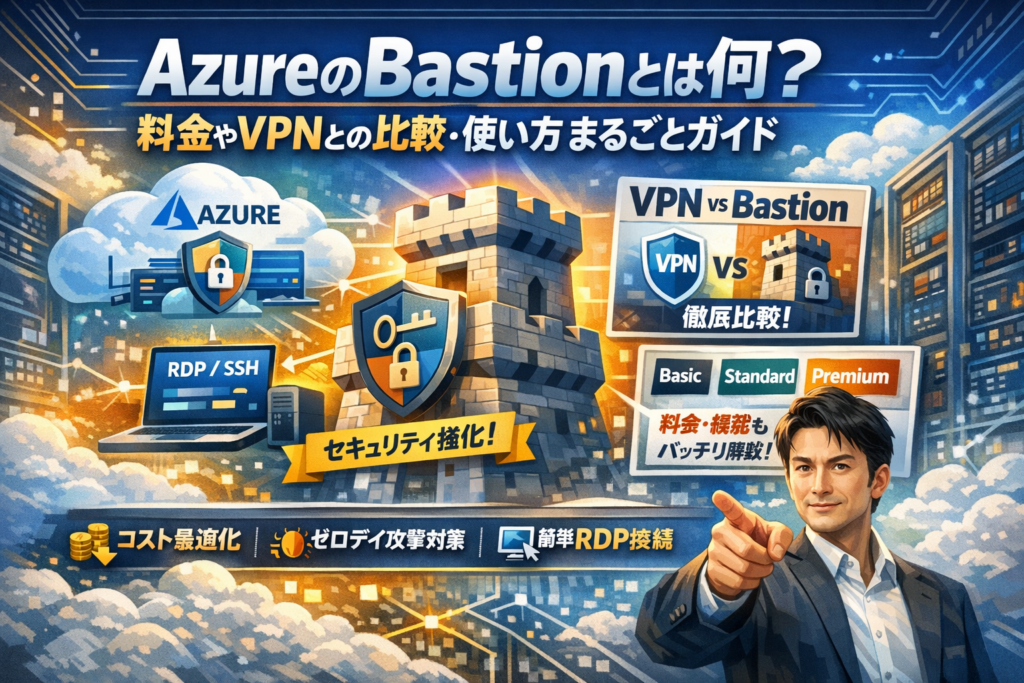 この記事を読み終える頃には、「自社はVPN優先かBastion優先か」「どのSKU構成ならセキュリティと運用負荷と価格のバランスが取れるか」「どのNSG設定とサブネット設計ならトラブルなく運用できるか」が、自分の環境に引き寄せて判断できる状態になります。Azure Bastionを単なるセキュリティ機能ではなく、クラウド全体のIT投資戦略の一部としてどう位置づけるかを明確にしたい方は、このまま読み進めてください。