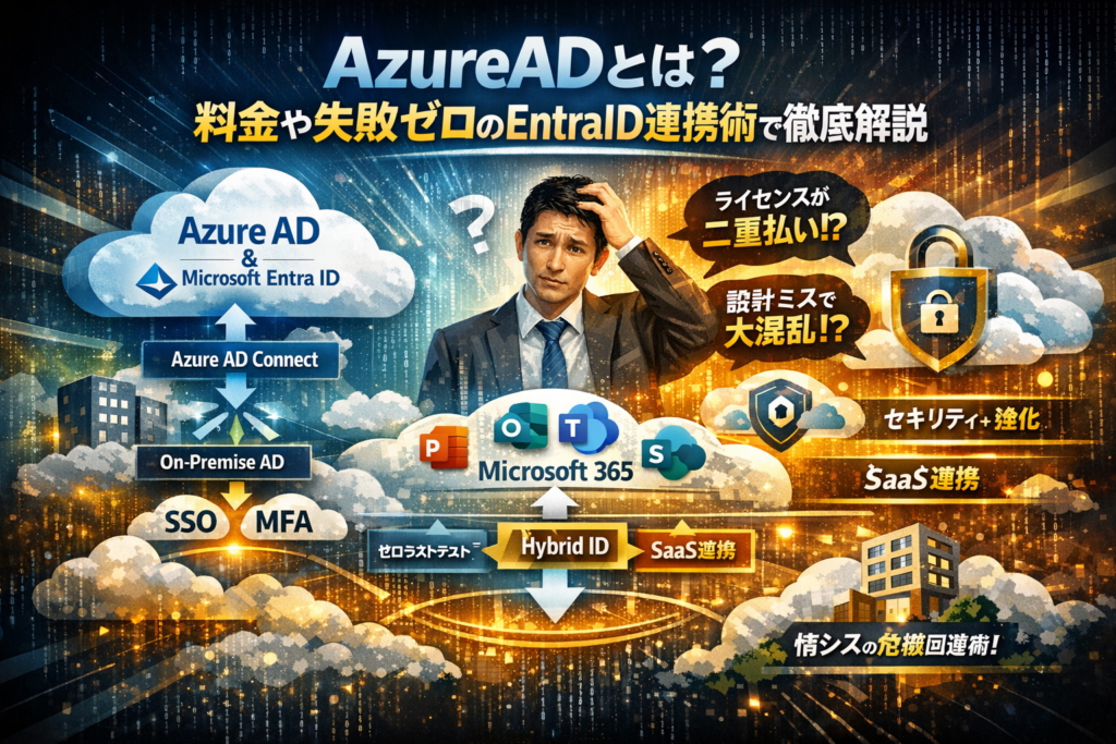 本記事では、Azure ADとは何か、Active DirectoryやMicrosoft 365との関係、Azure AD 料金とプラン選定、ハイブリッドID構成、条件付きアクセスまでを「情シス兼務の担当者」が判断できるレベルに分解します。さらに、Azure PortalやAzure ADにログインできないときの初動、SaaS乱立後にSSOを追加して破綻する典型パターン、Free前提で設計してからPremium必須だと気づく失敗など、現場で実際に起きているワナと回避手順を具体的に示します。