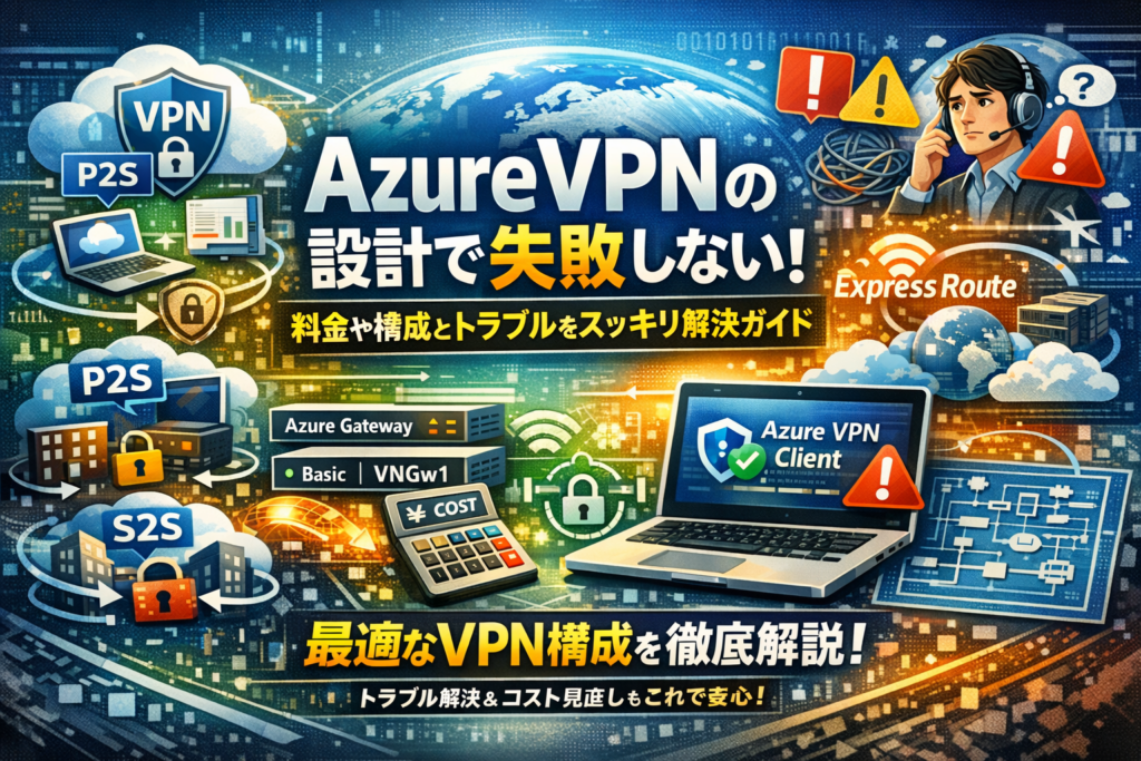 Azure VPNの検討を先送りしている間にも、ネットワーク構成の選択ミスや料金の読み違いで、静かにコストと信頼が削られていきます。VPN自体は分かるが、Azure VPN GatewayやAzure VPN Client、P2SやS2S、ExpressRoute、VNetピアリングのどれをどう組み合わせるべきかが曖昧なまま設計すると、数年後のSKU廃止やBasic SKUの制約で再設計を迫られます。さらに、Azure VPN Clientがインストールできない・接続できないたびに現場対応が止まり、本来やるべき業務が後ろ倒しになります。