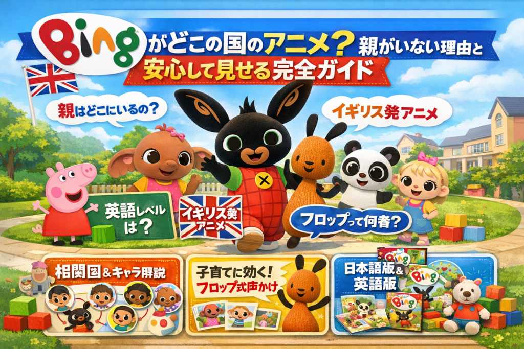 「bingどこの国アニメ?」と検索している時点で、すでに小さな損をしています。国名だけなら数秒で知れますが、ビングが「イギリス発の幼児向けアニメ」だと分かったところで、本当に欲しい答えはそこで終わりではないはずです。親がいない理由は安全なのか、フロップは何者で何の動物なのか、まんまビングだねの意味は子育てにどう効くのか、日本語版と英語版をどこで見れるのか、ビングアニメにイライラするときどう受け止めればいいのか。ここを曖昧なままにすると、せっかくの良質なコンテンツも、ただの「子守り動画」で終わってしまいます。この記事では、ビングアニメの国と設定、キャラクター相関図、親がいない世界観の狙いを制作現場の発想まで踏み込んで整理しつつ、フロップ式の声かけを明日から使えるレベルにまで分解します。さらに、ビングアニメどこで見れるかという視聴ルート、日本語版と英語版の選び方、ペッパピッグとの英語レベル比較、ぬいぐるみや絵本の使い方まで一気通貫でまとめました。読み終える頃には、「なんとなく流すアニメ」が、家の中で使える具体的な子育てとおうち英語のツールに変わります。