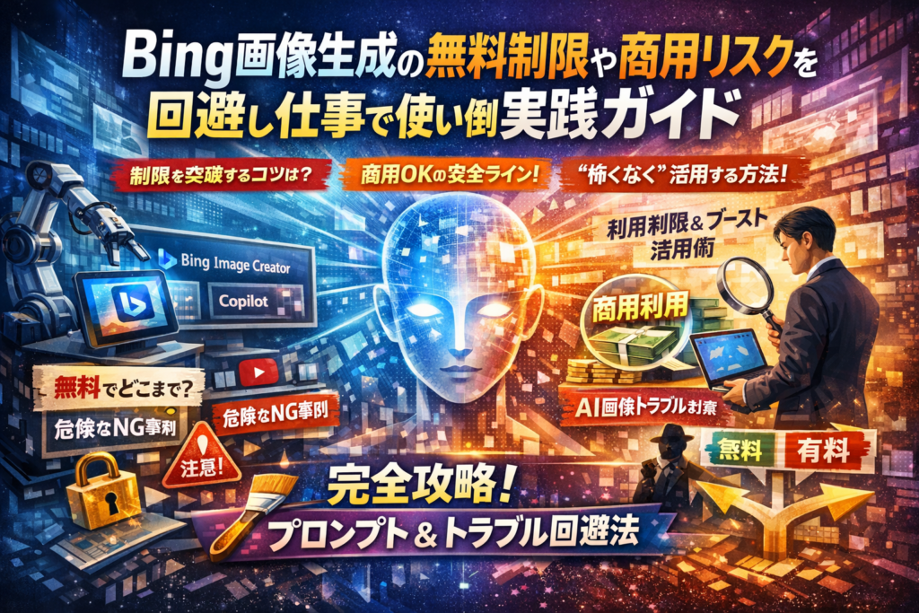 Bing画像生成を「とりあえず無料で便利そう」とだけ捉えていると、商用リスクと機会損失の両方を抱えたまま走ることになります。実務で重要なのは、きれいな画像ではなく、どこまで無料で安全に使い倒し、どこから有料ツールや人の手に切り替えるかを線引きできているかです。