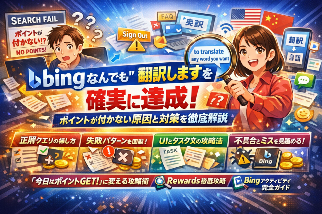 Microsoft Rewardsを毎朝回しているのに、「bing なんでも翻訳します」だけ何度やってもポイントが付かない。この状態を放置すると、時間だけ失い続けます。原因は、正解ワード探しではなく、「なんでも翻訳します bing の検索結果をお好みの言語に翻訳できます」というタスク文の意味を取り違えていることがほとんどです。本記事では、英語UIの“to translate any word you want”を手掛かりに、このタスクを単語翻訳アクティビティとして正しく読み解くところから始めます。Rewardsのアクティビティカードの開き方、通りやすい検索クエリの型、サインイン漏れや即離脱などの典型ミス、「Bingで探す 不具合」と「単なるやり方の問題」の切り分けまで、実務レベルで分解します。さらに「料理するのはお疲れですか Bing」「Bingでお得な情報を見つける」「ボキャブラリを増やす」など他のBingアクティビティにも共通するタスク文読み解きテンプレを提示し、今後の新タスクにも転用できる思考法をまとめました。この記事を読み終えるころには、「今日はポイントが付くか不安」という運任せから、「狙って確実に達成する」状態へ移行できます。
