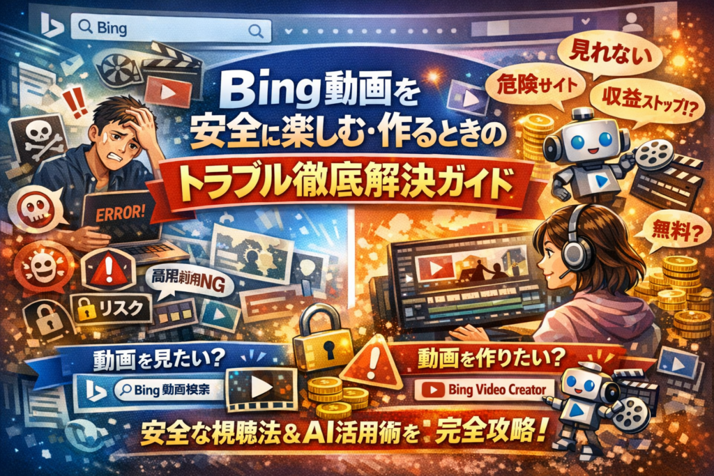 Bing動画をなんとなく使い続けていると、実は大きな損をしている可能性があります。動画が「見れない」原因をBingだと思い込み、延々と設定をいじって時間を失ったり、無料で動画を見れるサイトを安易に踏んで広告やマルウェアまみれになったり、Bingの動画生成AIで作った動画を商用利用してから広告審査で止められる。このあたりの落とし穴は、機能紹介やマニュアルだけを読んでもまず見えてきません。