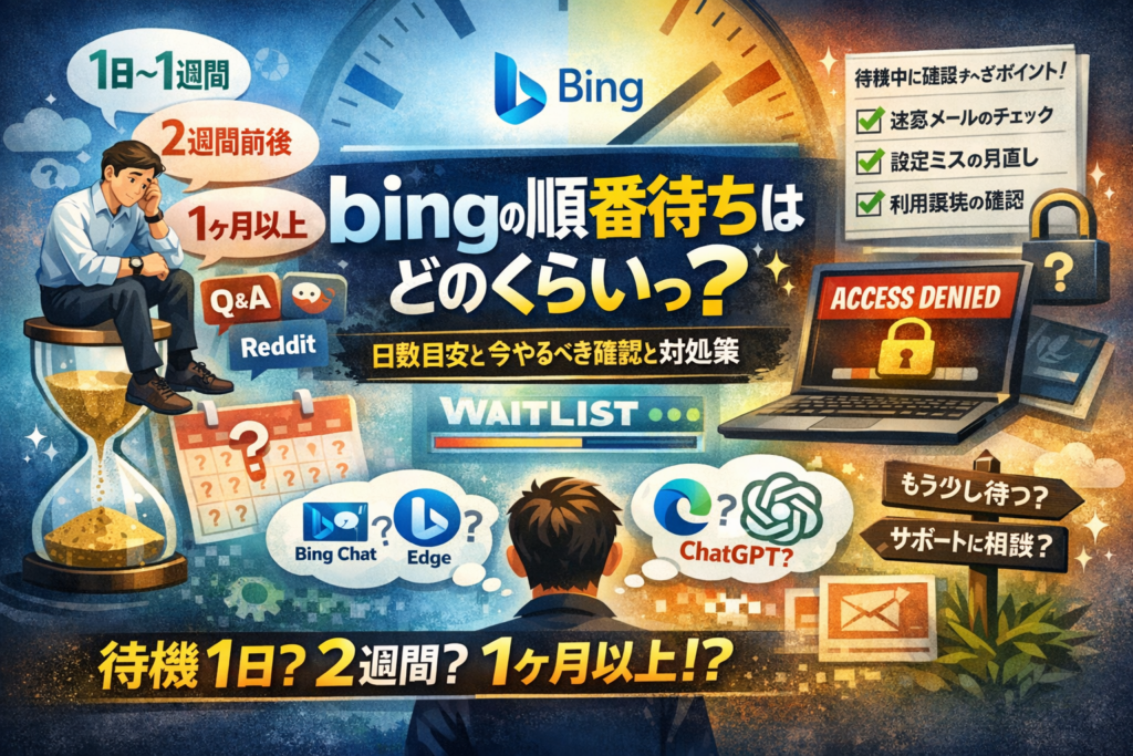 bingの順番待ちはどのくらいなのか。申し込みから何週間も経っているのに新しいBingやBing Chatが使えず、「自分だけ遅いのでは」「設定ミスでずっと門前払いされているのでは」と感じているなら、すでに時間と機会を失っています。この記事では、知恵袋やMicrosoft Q&A、Redditなどの実例から、1日〜1週間で解放される人、2週間前後で通過する人、1か月以上放置される人の分布を整理し、あなたの待機日数がどのゾーンにいるのかをはっきり可視化します。