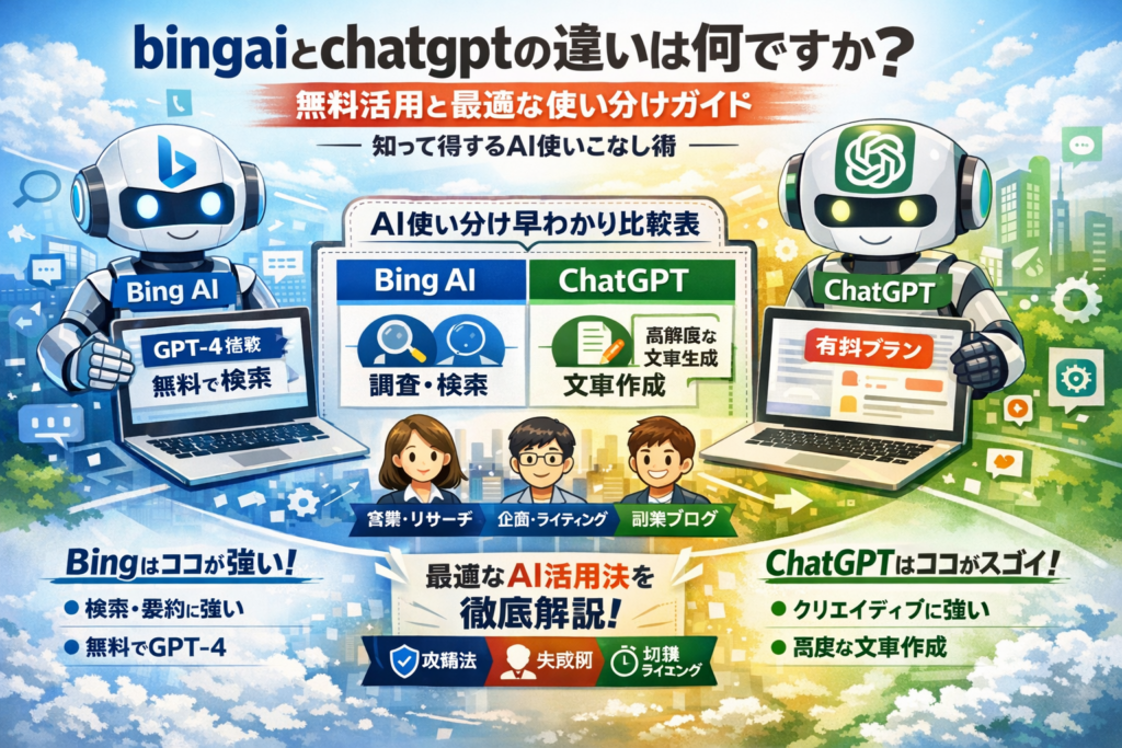 この記事では、その過程で整理し直した「どの場面でBing AIチャットを使い、どの場面でChatGPTを使うか」という判断軸を、営業・マーケ・企画・副業ブログの仕事単位にまで落とし込んでいます。単なる機能紹介ではなく、私が経営者として費用対効果を見極めるときに使っている視点を、できるだけ具体的に共有したいと考えて執筆しました。