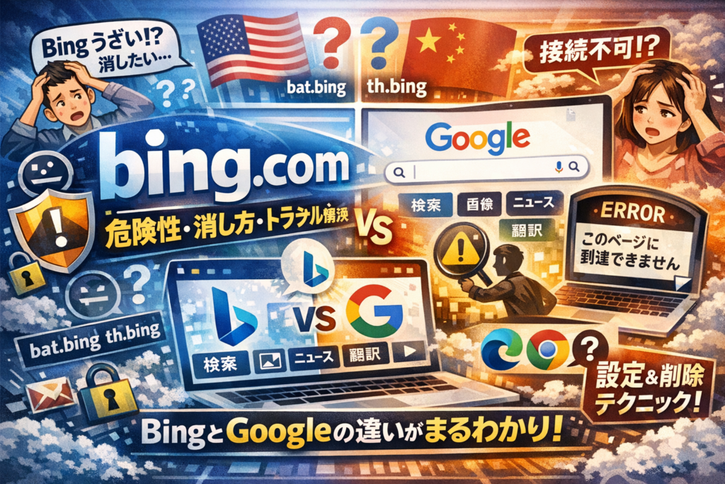 Bingやbing comとは何かがあいまいなまま、Edgeを開くたびに勝手にBing検索が立ち上がり、「Bing うざい」「Microsoft Bing いらない」と感じていませんか。さらに、bat.bing.com とは何か、th.bing.com とは危険なのか、Www Bing com 接続 できないや「申し訳 ご ざいません このページに到達 できません」が頻発しても、原因がBingなのかPC設定なのか切り分けられないままだと、ムダな時間と不安だけが積み上がります。