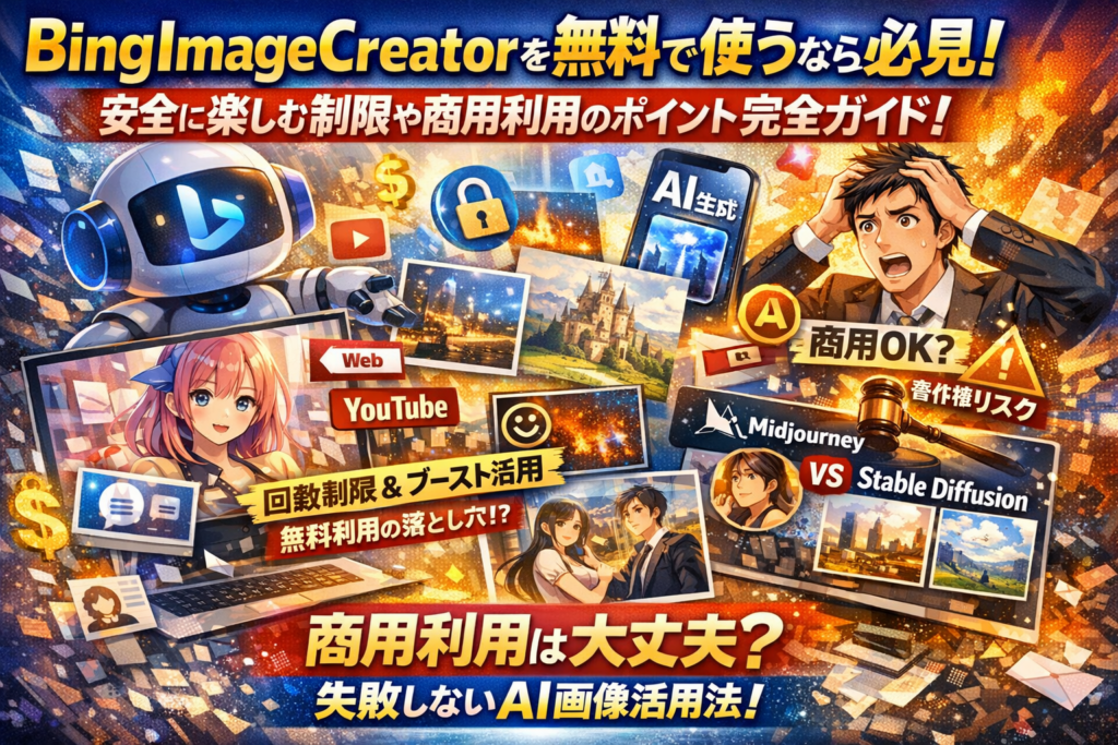 この記事では、Bing Image Creator 無料の本当の範囲、ブーストと回数制限の現実、スマホやアプリでの使い方、Bing Image Creator 日本語プロンプトで美少女やアニメ風を狙うコツ、そして商用利用でバレると言われる理由までを、現場基準で整理します。MidjourneyやStable Diffusionなど他の画像生成AIとの使い分けも踏まえ、どこまでを無料で攻め、どこから有料ストックや自社制作に切り替えるかを具体的に線引きします。ここを押さえずにBing Image Creatorを使い続けるか、この記事を踏まえて「安全に稼げる使い方」に変えるかで、今後の制作と集客の効率は大きく変わります。