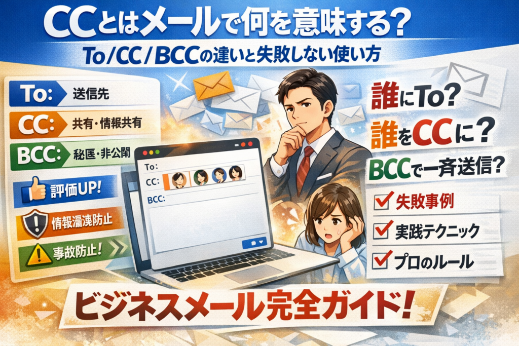ビジネスメールの「CCとは何か」を曖昧なままにしておくと、気づかないうちに評価と信頼を削ります。宛先をToにするかCCにするか、BCCとの違いをどう設計するかで、「誰が動くのか」「誰が知っておくべきか」「誰のアドレスを守るべきか」が決まり、仕事の速さもトラブルリスクも変わります。多くの人が、メールのCCとは単なる「カーボンコピー」だと理解を止めている一方で、現場では「メール返信時にCCはそのままか」「上司をCCに入れないと怒られるが、入れすぎるとメールCCうざいと言われる」といったグレーゾーンで日々迷っています。この記事では、To/CC/BCCの違いを一度で整理し、ビジネスメールCCの正しい使い方、CCとBCCの違いと使い分け、GmailやOutlook、iPhoneメールでの具体的な設定方法までを一気通貫で扱います。さらに、「メール返信でCCを外すか」「一斉送信でBCCをどう使うか」といった判断基準と、今日から使えるチェックリスト、CCルールづくりの実務的なヒントまで踏み込んでいます。読み終えた時点で、「このメールは誰をTo、誰をCC、誰をBCCにすべきか」を自信を持って決められるようになります。