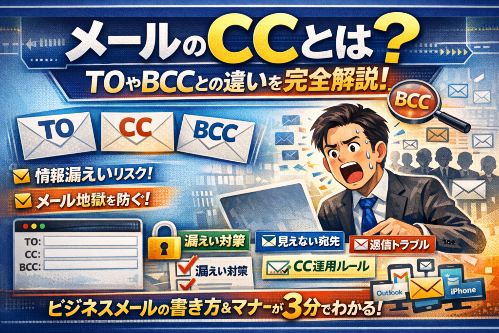 本記事では「メールのCCとは何の略か」という基本から、宛先とCCとBCCの違い、ビジネスメールでの書き方とマナー、CC付きメールへの返信ルール、GmailやOutlook、iPhoneメールでの具体的な設定方法まで、現場で迷いがちなポイントを一気に整理します。さらに、全員CC文化が生むCCスパムの構造や、情報共有と情報漏えいの境界線、組織としてのCC運用ルールの作り方まで踏み込みます。読み終えるころには、「誰をTOにし、誰をCCやBCCに入れるか」を数秒で判断でき、余計なメールとリスクを確実に減らせるようになります。ビジネスメールを毎日使うなら、ここで一度CCの使い方をアップデートしておかない手はありません。