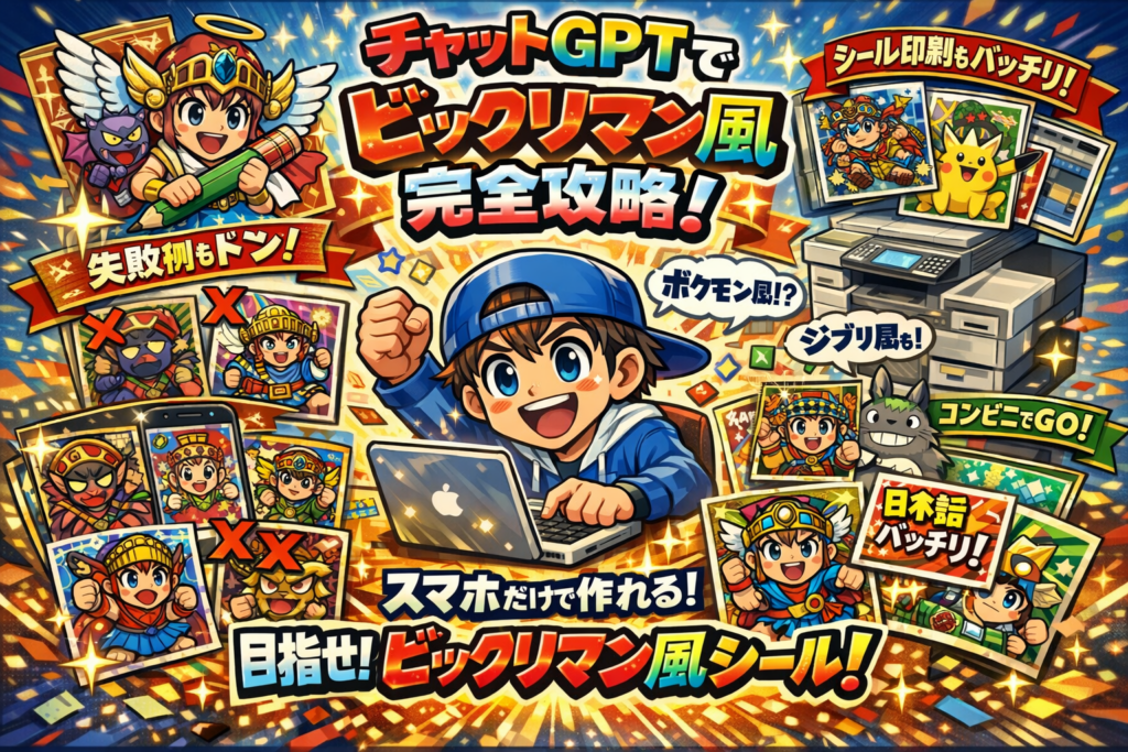 この記事を読み終えるころには、「なんとなく真似する」段階から、「狙って当たりを引く」段階に移行し、推しや友だちのビックリマン風シールをスマホだけでコンビニ印刷までやり切れる状態になります。ビックリマン以外のポケモン風やジブリ風、レトロRPG風への広げ方や、専用アプリ・ビックリマンシール作成AIとの使い分けも含めて、ここを一度押さえておけば、これ以上の再検索に時間を使う必要はありません。
