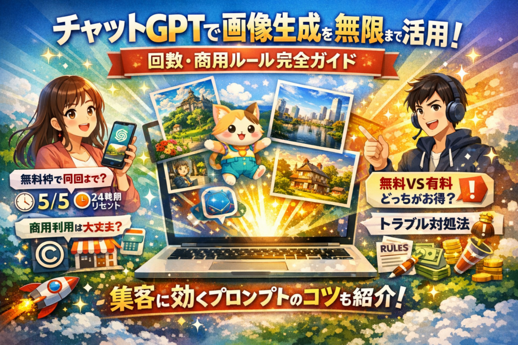 この記事では、チャットgpt画像生成無料のやり方をスマホアプリとPCブラウザの両方で具体的に解説しつつ、「無料枠でどこまで」「何枚・何回まで」「どこから有料が得か」を実務目線で整理します。さらに、かわいいキャラクター風やおしゃれなイラストを安定して出すプロンプトの型、画像が生成されない・時間がかかりすぎるときの対処法、商用利用や著作権リスクを避けるルールまで一気通貫で扱います。