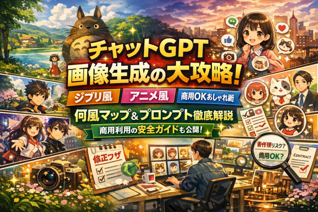 この記事は「チャットgpt 画像生成 種類」を軸に、アニメ風種類やジブリ以外のテイストを含めた何風マップと、かわいい・おしゃれ・ビジネス向きに分類した実務プロンプトを一冊分レベルでまとめています。さらに、チャットGPTで写真は作れるのか、生成画像は商用利用できるのか、ジブリ風指定はどこまで危険なのかを、現場で実際に使われているガイドライン感覚に沿って解説します。この記事を読み終える頃には、「何風一覧を眺めて真似る」段階を抜けて、自分の案件に合わせてChatGPT画像生成を狙って再現できる側になれます。読み進めるほど、プロンプト迷子になる時間と、知らずに踏むリスクを同時に削れるはずです。