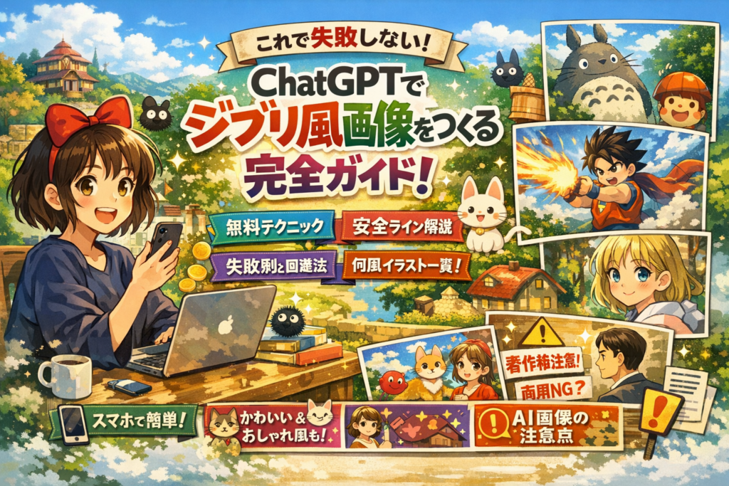 中小企業や個人ビジネスの現場で実際に起きた「ジブリ風やりすぎ」クレームや、社内ルールなしでAI画像を使ったときのリスクも、著作権と利用規約の観点から線引きを提示します。この記事を読み進めれば、スマホとiPhoneだけで、安全ゾーンを守りながら、ジブリ風もそれ以外の何風も迷わず量産できる状態まで一気にたどり着けます。