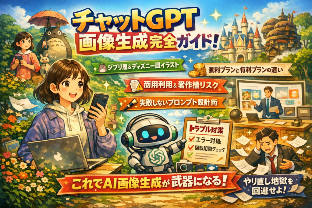 本記事は「チャットgpt 画像生成 やり方」を、PCブラウザとスマホアプリの具体的な手順から、ジブリ風やディズニー風など何風イラストの安全なスタイル指定、無料とPlusの費用対効果、画像が表示されない・ぐるぐるして進まない時の対処法まで、実務でそのまま流用できるレベルで整理しました。