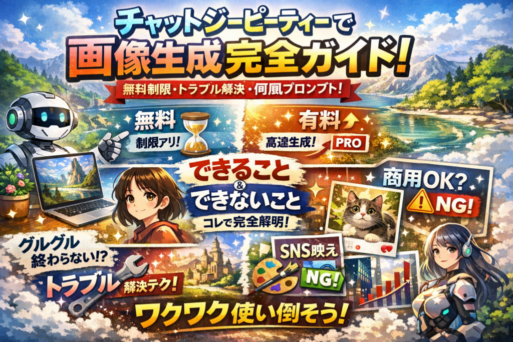 チャットジーピーティーで画像生成を試したのに、ぐるぐる回って終わらない、時間がかかる、そもそも「できない」理由が分からないまま手を止めていませんか。無料なのか有料なのか、何分待てばいいのか、1日の上限や制限も曖昧なまま使うと、業務もSNS運用も静かに目減りしていきます。しかも「ジブリ風」「〇〇風」で攻めたいのに、ポリシー違反や著作権が怖くて踏み込めない。これが、今いちばん大きな見えない損失です。
