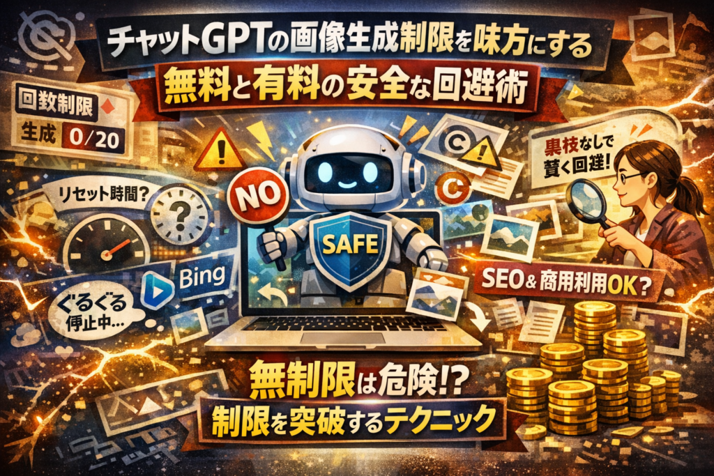「チャットgpt 画像生成 制限 リセット」「制限 裏技」と検索したくなる状況でも、規約違反に踏み込まず、安全に作業を止めない方法は十分にあります。モデル選択や時間帯の工夫で実質の生成回数を底上げし、CanvaやBingなど他のAIツールと組み合わせて、1日の上限にかかっても制作を継続する具体的なワークフローを示します。さらに、炎上を防ぐためのポリシーと著作権の境界線、SEOやMEO、広告でAI画像を使うときの判断基準まで、Web担当者が「今すぐ直すべき運用」と「社内ルールとして決めるべきこと」を一気に整理できる内容です。この記事を読み進めるかどうかで、今後のAI画像活用の安定度ははっきり変わります。