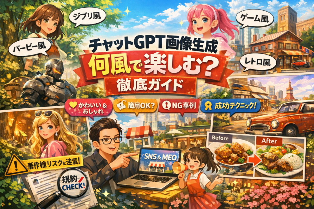 本記事では、ChatGPTの画像生成機能を使った「何風」の全体地図を示し、人気スタイルの一覧だけでなく、用途別にどの画風を選ぶべきかを実務レベルで整理します。ジブリ風AI画像やキャラクター風イラストを、どこまで指定すると著作権リスクになるのか。ドラえもん風やドラゴンボール風などが拒否されたり、怖いフィギュアのような画像になる本当の原因はどこか。そこから逆算したプロンプトテンプレとリライト例を、アイコン、企業SNS、MEO、採用サイトまでカバーして提示します。