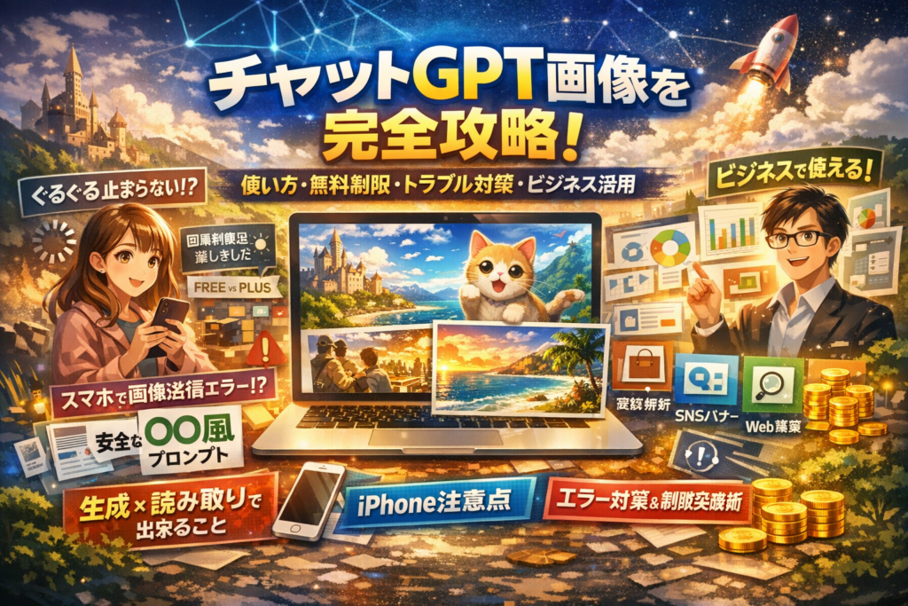 ChatGPTで画像生成を試したものの「ぐるぐるが終わらない」「スマホから画像が送れない」「無料制限にすぐ当たる」と感じているなら、そのまま運用を進めるほどビジネスの機会損失は大きくなります。本記事は、チャットgpt画像の使い方から制限、トラブル対処、商用利用の安全ライン、Web集客での活用法までを一気通貫で整理した実務ガイドです。