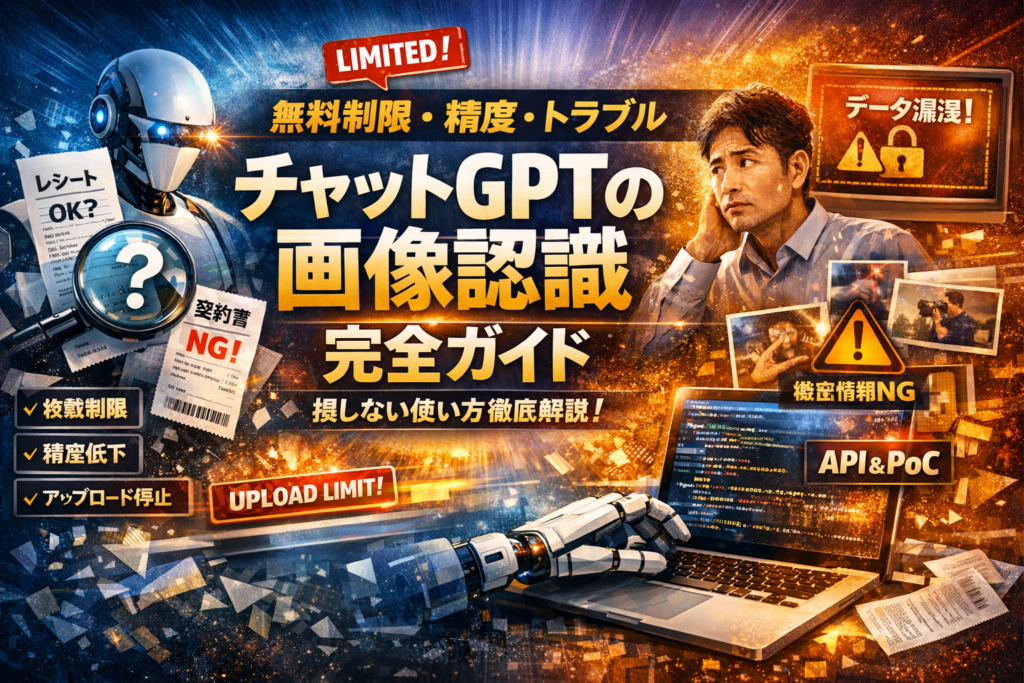本記事は、よくある機能紹介ではなく、チャットgpt 画像認識でどこまで任せてよくて、どこから人が必ずチェックすべきかを軸に、無料と有料の境界、画像読み込みの制限、精度が落ちる典型パターン、「チャットgpt 画像認識 無料」「チャットgpt 画像認識 制限」「チャットgpt 画像認識 精度」「チャットgpt 画像認識 できない」といった再検索ワードの行き止まりを一気に整理します。PCとアプリでの具体的なやり方から、「チャットGPTに写真を送る危険」の現実的ライン、さらにAPIでの画像認識の料金感とPoCの勘所まで、部署展開できるレベルの実務ロジックだけを詰め込みました。ここで得られるのは知識ではなく、明日からチームの運用を変えられる判断基準です。
