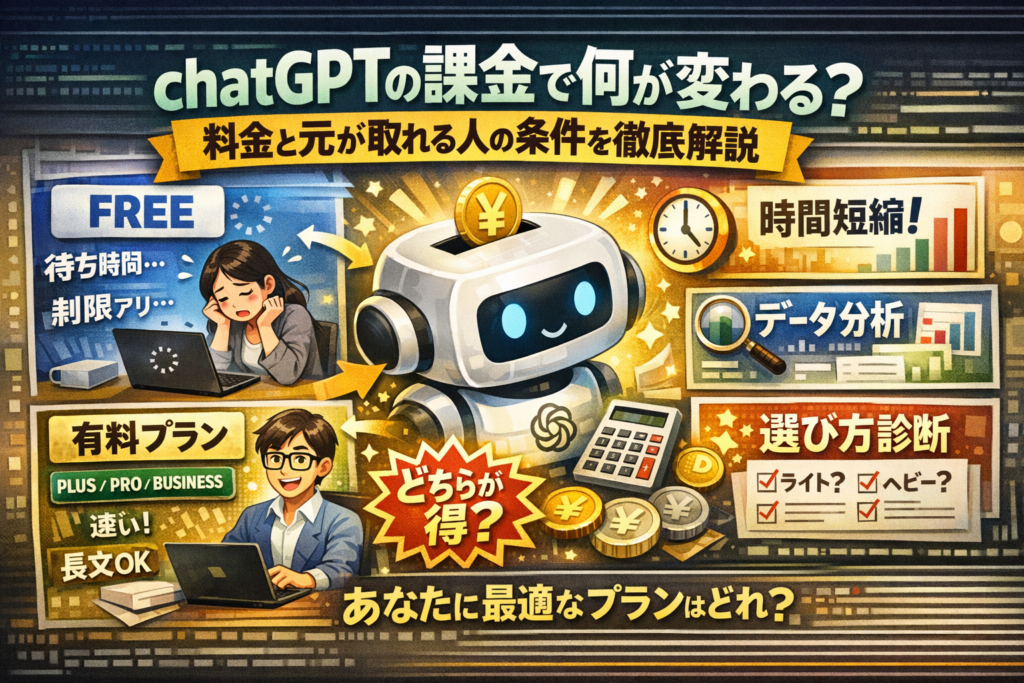 結論として、たまに質問するだけのライトユーザーは無料で十分です。しかし、仕事や学習で毎日使う人や画像生成・データ分析を業務に組み込みたい人は、適切な有料プランを選ばないと逆に時間単価を下げ損ねます。この記事を読み進めれば、「自分はどのプランに、いつ、どの手段で課金すべきか」を迷いなく決められるはずです。